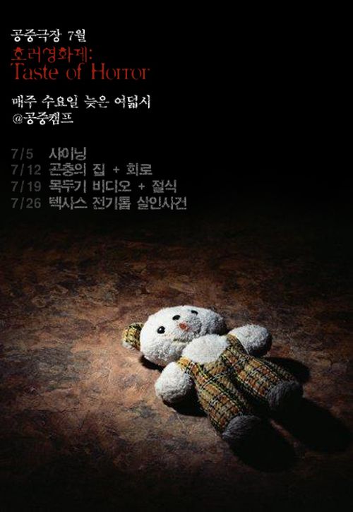 공중캠프에서 7월 매주 수요일마다 공포영화를 상영한다고 합니다. 상영작 모두 햠량충만한 작품들이라 후회하시진 않을 겁니다. 샤이닝이야 워낙 유명한 작품이고, 곤충의 집과 절식은 우메즈 카즈오 50주년을 기념하여 제작된 영화로 전주영화제를 통해 소개된 바 있습니다. 목두기 비디오는 한국 최초의 페이크 (공포) 다큐멘터리로 몰카괴담으로 유명했었고, 텍사스 전기톱 살인사건은 리메이크 작이 아닌 오리지널 판으로 리메이크에 실망하신 분들께 좋은 추억이 될 것입니다.